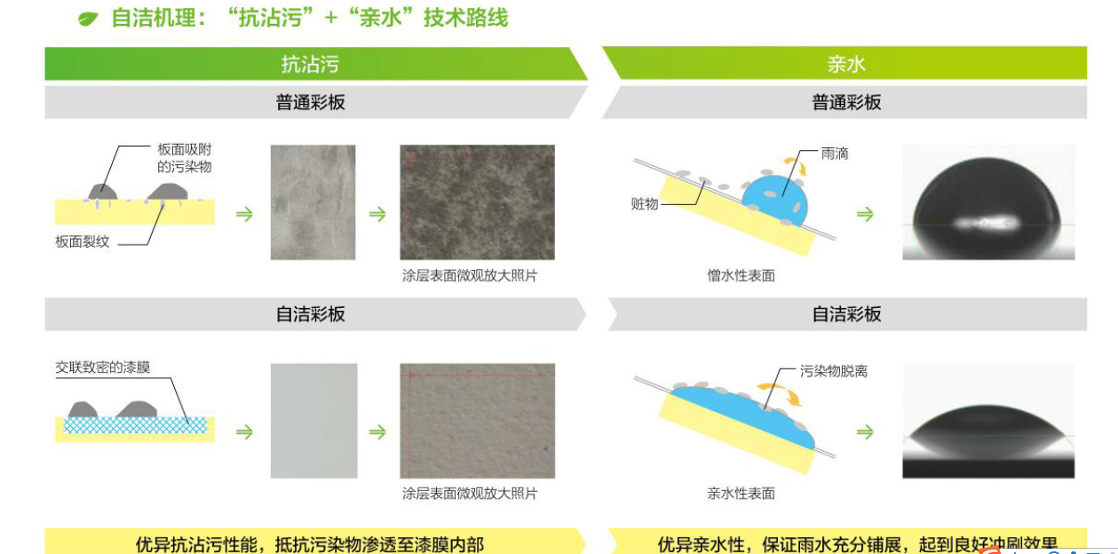 優異的抗沾污性能,能抵抗污染物滲透到漆膜內。優異的親水性能保證了雨水充分展開于涂層表面,起到良好的沖刷效果。