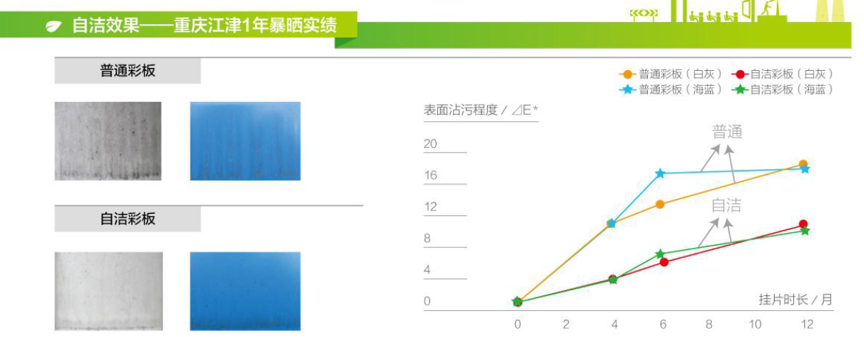 自潔彩板是一種新型的戶外建筑用彩涂鋼板。它的有機涂層除了具有普通彩板的高裝飾性及耐候性外,還具有特殊的自清潔功能。采用這種材料制成的廠房不需要人工清洗維護,只借助于雨水的沖刷就能在空氣質量較差的工業和城市地區保持屋頂和墻面彩板的外觀鮮艷性,保持彩色涂層的高裝飾性。