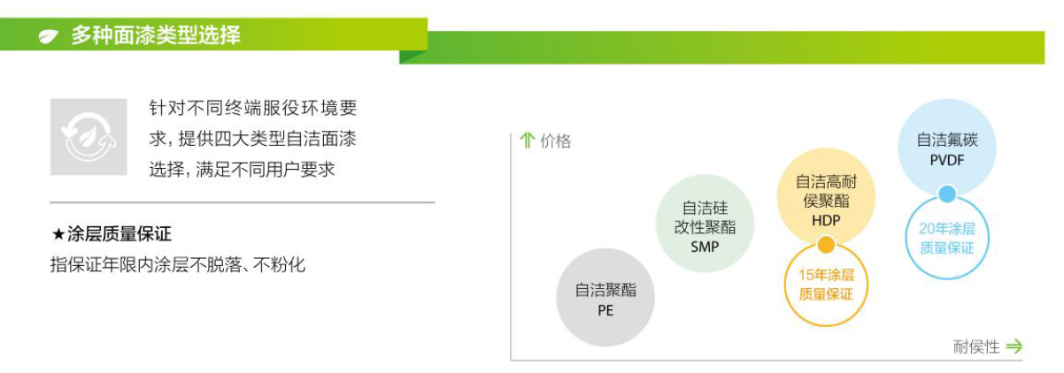 針對污染灰塵較大的地區的建筑用材,是一款擁有自我清潔功能的彩涂鋼板,特殊的“親水+抗玷污“面漆結構設計,除具有優異的高裝飾性及戶外耐久性,不需要人工清洗維護,只需要借助雨水的沖刷就能在空氣質量較差的工業和城市地區保持屋頂和墻面持久潔凈。 |