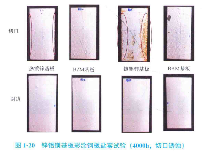 采用相同規格、相同鍍層厚度的BZM基板和熱鍍純鋅基板生產的相同涂料品種的彩涂鋼板,采用經過鹽霧試驗結果,500h鹽霧試驗條件下,加鎂后(BAM和BZM)。提高了鍍鋁鋅基板和熱鍍鋅基板聚醋白灰鋼板切口耐蝕性不低于50%;4000h鹽霧試驗后。鋅鋁鎂某板彩涂鋼板切口部位還未發生紅銹。