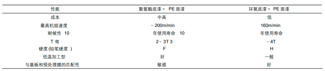 此外,國外的卷鋼涂料供應商還系統比較了環氧底漆和聚氨酯底漆與普通聚酯面漆配套后的優缺點, 具體列于下表 。