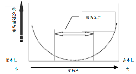 較高的表面交聯密度-使污染物難以牢固吸附 ,親水性表面-使涂層表面在被雨水浸潤后污染物與涂層的接觸角增大,并降低污染物與涂層間的吸附 功,在接近 180 后被雨水移去。