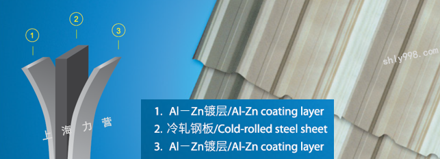 顧名思義,與鍍鋅板的區別是多了個鋁的元素,鍍鋁鋅板的表面鍍層由 55%鋁、43.4%鋅與1.6%硅在高溫下固化而組成,其整個結構由鋁-鐵-鋅,形成致密的四元結晶體,從而形成一層強有效防止腐蝕因子透穿的屏障。耐腐蝕性來自鋁的障礙層保護功能,和鋅的犧牲性保護功能。當鋅在切邊、刮痕及鍍層擦傷部份作犧牲保護時,鋁便形成不能溶解的氧化物層,發揮屏障保護功能。