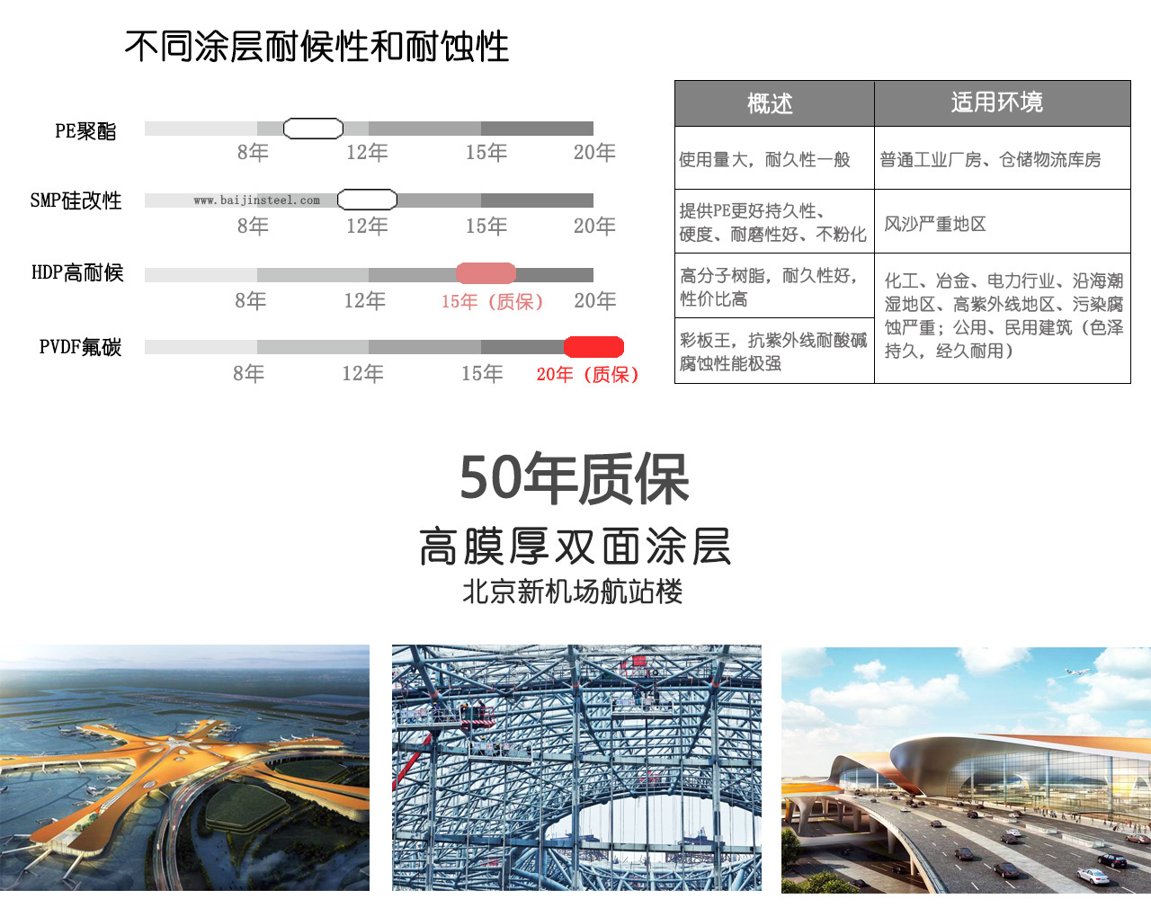 4) 氟碳彩涂板(PVDF):在建筑工業(yè)用彩涂鋼板涂料中,屬于最高級產(chǎn)品,耐化學(xué)性極佳,機(jī)械性能,耐紫外線和耐熱性很突出,一般環(huán)境其防蝕年限可達(dá)20-25年一般有少量現(xiàn)貨,量大需提前30天預(yù)訂。