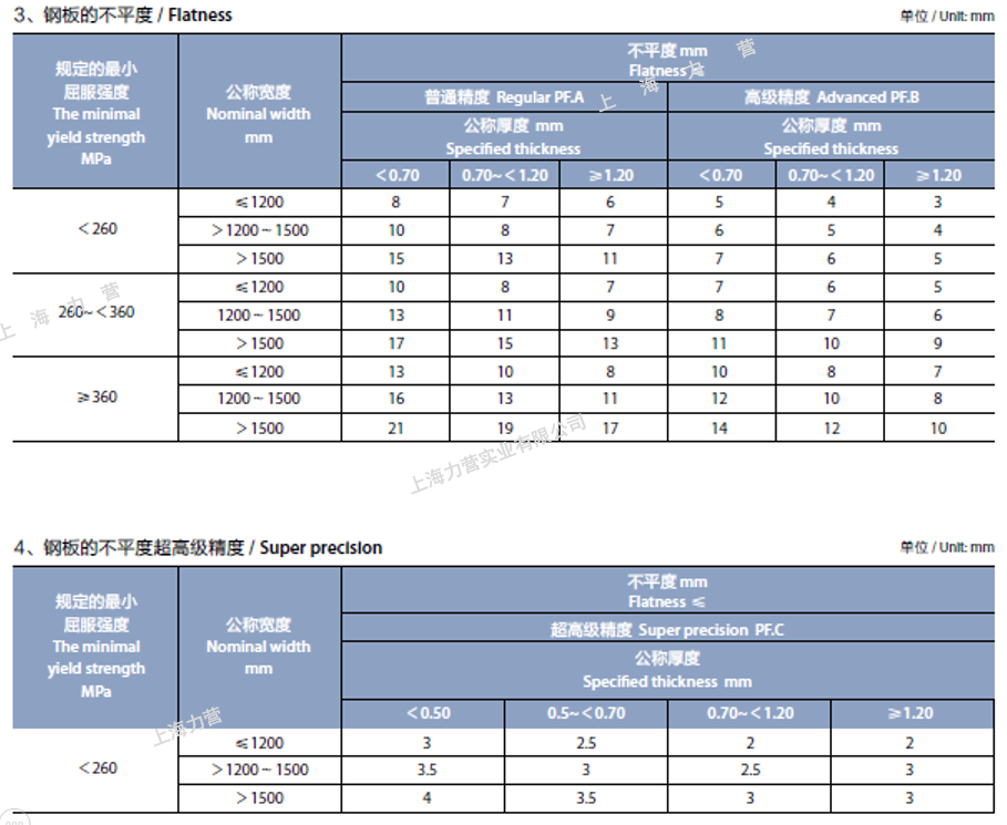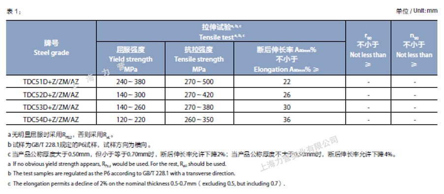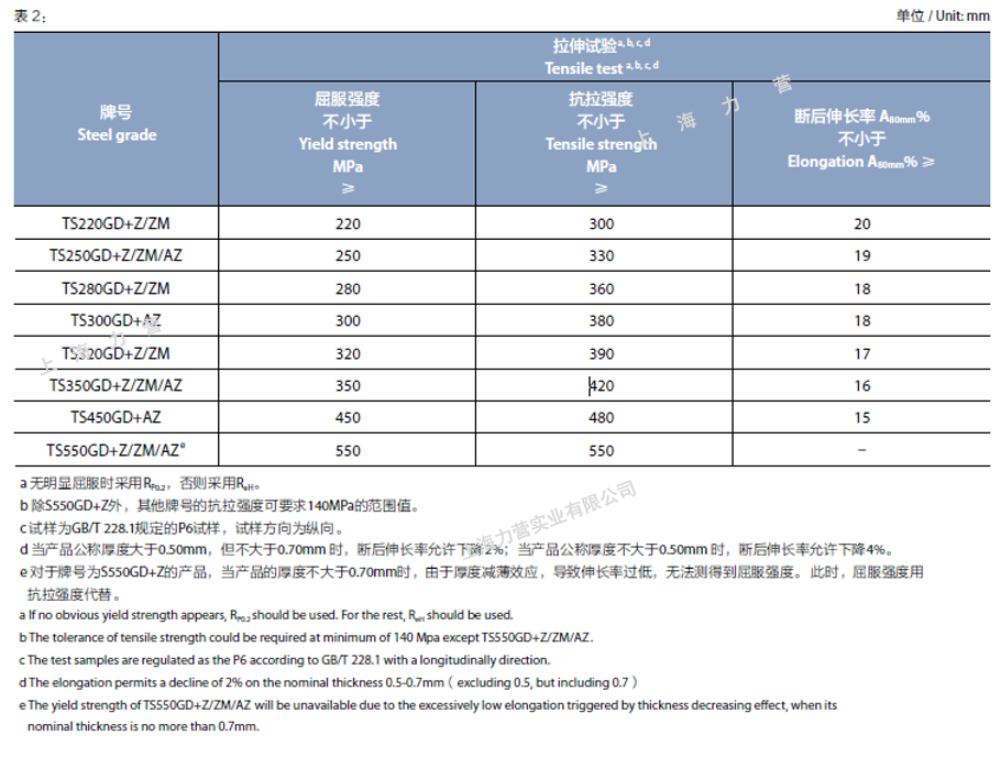 3、鍍鋁鋅、熱鍍鋅基板彩涂的不平度、力學(xué)性能按照相應(yīng)基板,下表數(shù)據(jù)供參考,具體以訂貨標(biāo)準(zhǔn)為準(zhǔn)。