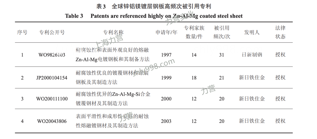 根據專利的銓敘規則,被引用頻次、同族數量、重要申請人等多方面因素,篩選出所需要的專利。全球鋅鋁鎂鍍層鋼板部分高頻次被引用專利詳見下表。從表中可以看出日本的日新制鋼和新日鐵在90年代已經申請,并被多次引用,且這些專利還處于有效的狀態中。 (先感慨下國外的工業技術發展!)