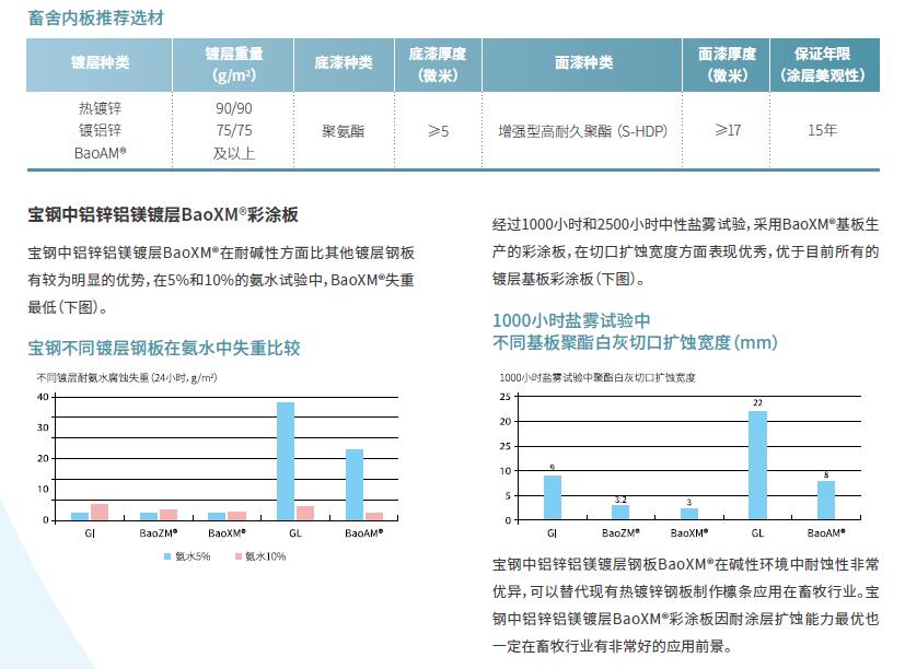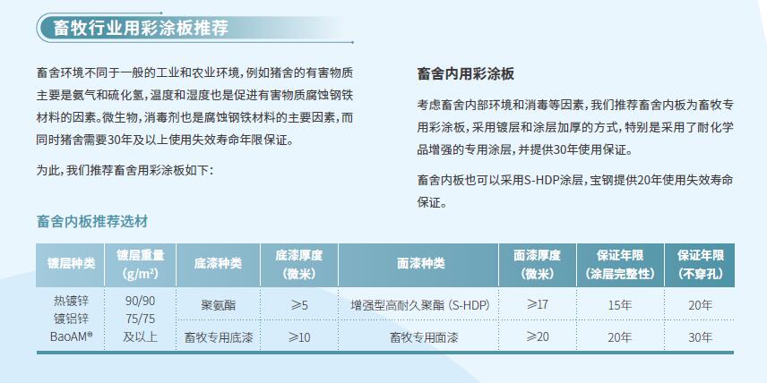 畜舍外部環境基本正常,我們推薦采用熱鍍鋅或者鍍鋁鋅基板,涂敷耐候性和耐化學品良好的S-HDP涂層,并提供15年美觀壽命保證,預計使用失效壽命大于30年。